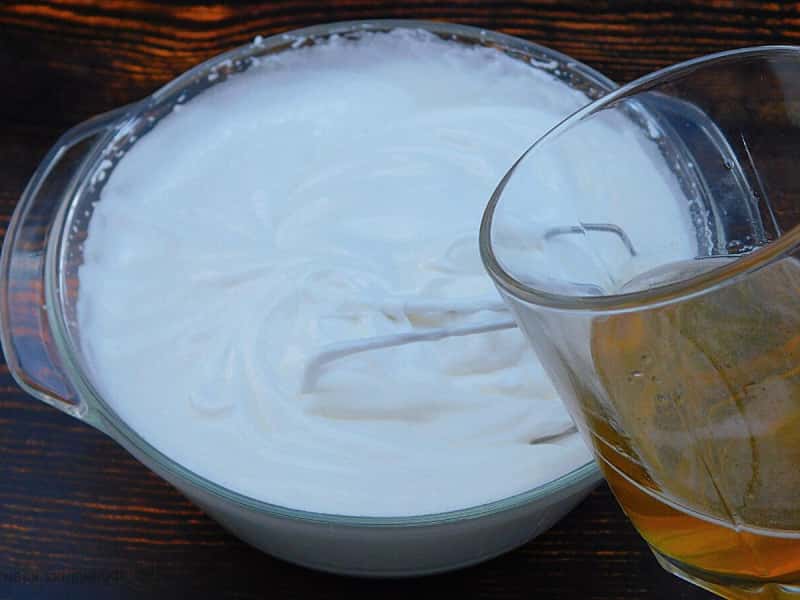 - Збити білки міксером, підсипаючи в процесі по чайній ложці цукру. Продовжувати роботу до отримання консистенції твердих піків. Порціями ввести розчинений желатин, не припиняючи при цьому збивання.
