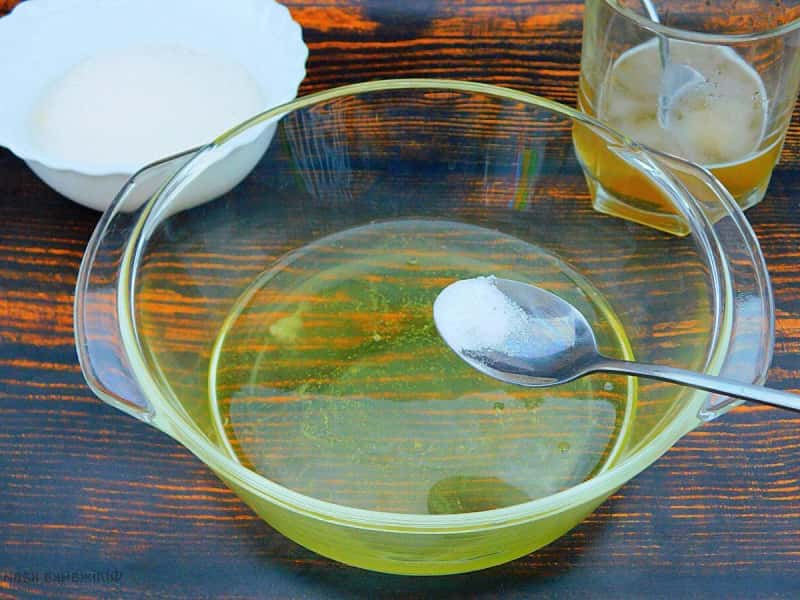 - Желатин замочити в воді відповідно до інструкції на упаковці, потім підігріти в мікрохвильовці до розчинення, але не кип’ятити. У білки додати дрібку солі.