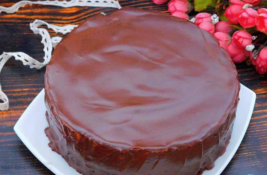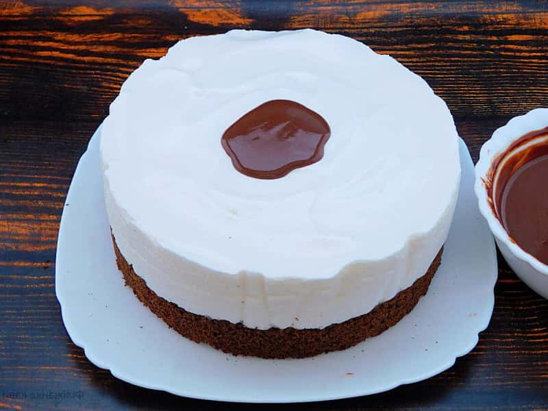 - Шоколад і вершкове масло розтопити в мікрохвильовці, дати трохи охолонути. Вилити спочатку на верх торта.