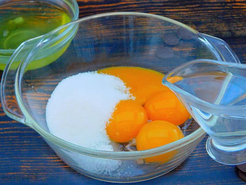 - Яйця акуратно розділити на білки і жовтки. Білки поки прибрати в холодильник. У жовтки всипати половину цукру, влити теплу воду температурою 40-50 градусів.