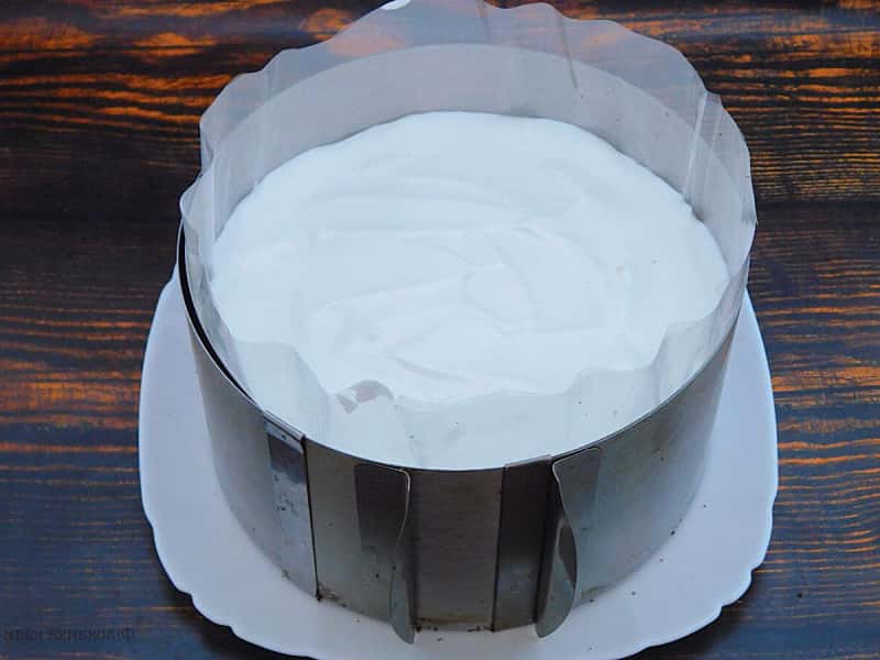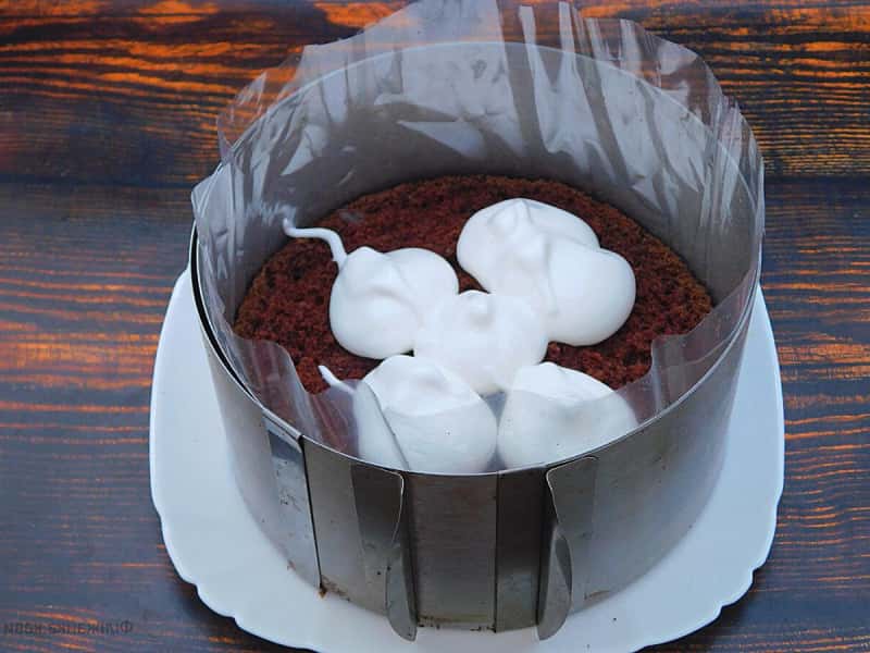 - Корж вийшов високим, тому верхівку можна трохи зрізати. Укласти шоколадну основу в кулінарне кільце. Для зручності стінки вистелити спеціальною плівкою для торта або ж розрізати рукав для запікання. Викласти білковий крем.