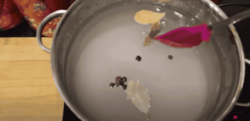 9. Робимо маринад. У каструлю наливаємо воду 3 літри. Висипаємо сіль із розрахунку на 1 літр 1 столову ложку та цукор 6 столових ложок, збільшуємо на свій обсяг. Перець запашний та лавровий лист. Перемішуємо, накриваємо кришкою та доводимо до кипіння. Вливаємо олію 100 мл на 1 літр води і оцет 100 мл, збільшуємо на свій об’єм. Даємо закипіти.