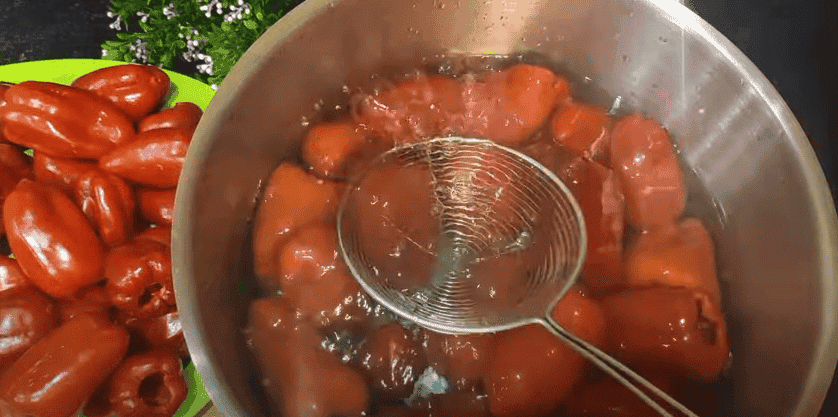 2. Каструлю краще взяти ширше, відправляємо перець в киплячу воду в один шар і бланшируємо 2 хвилини. Потім витягуємо, даємо закипіти воді і повторюємо процес. Залишаємо перець остигати.
