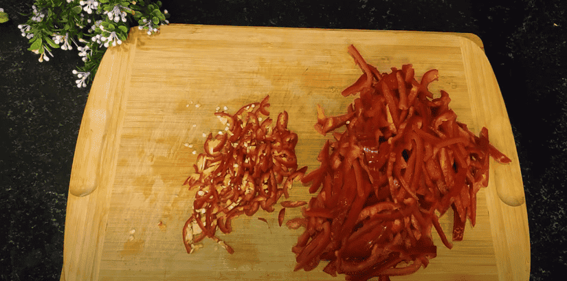 5. Солодкий перець для начинки 300 г нарізаємо соломкою в такт моркві. Гострий перець за бажанням, шаткуємо тонкими півкільцями. Насіння залишаю, дає гостроту. Часник, 10 зубків дрібно шаткуємо. Перекладаємо до овочів.