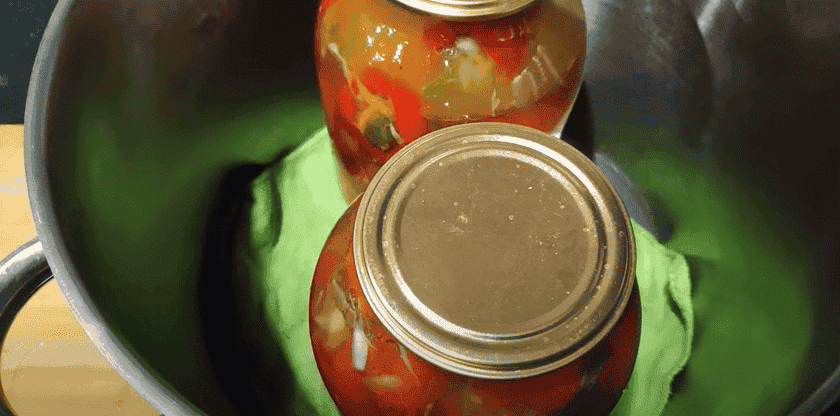 11. Каструля на плиті. На дно кладемо рушник або шматочок тканини. Встановлюємо банки у каструлю. Наливаємо гарячу воду по плічка банок, накриваємо кришкою, доводимо до кипіння на максимальній потужності. Потім потужність плити зменшуємо і кип’ятимо банки об’ємом 2 літри 25 хвилин з моменту закипання води, каструля накрита кришкою.