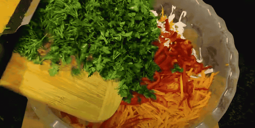 6. Петрушку та кріп нарізаємо і перекладаємо в миску. Всипаємо сіль 1 чайну ложку, коріандр свіжомелений 1 чайну ложку і перець чорний свіжомелений 0,5 чайної ложки. Все перемішуємо, перетираючи руками.