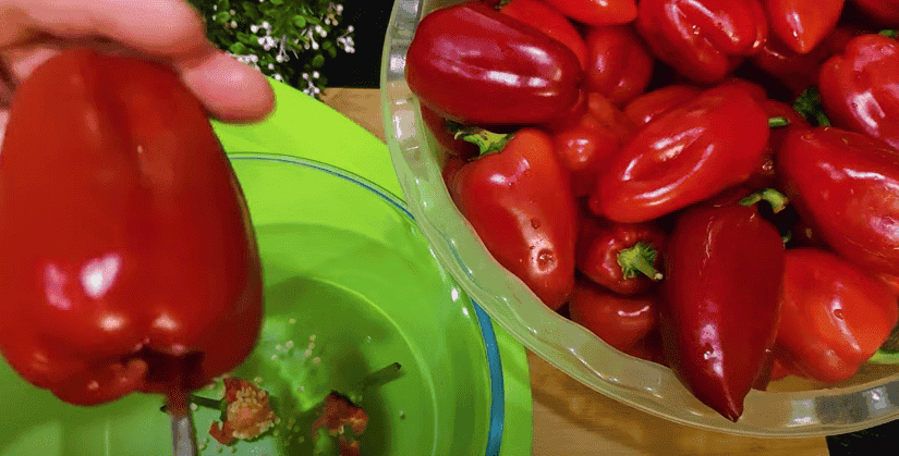 1. Беру невеликий солодкий перець, вага 3 кг. Перець очищаємо від насіння, видавлюємо плодоніжку в переці і витягаємо із насіннєвою коробочкою. Залишки насіння та перегородки видаляємо чайною ложкою. Відходів мінімум та начинка не випадає.