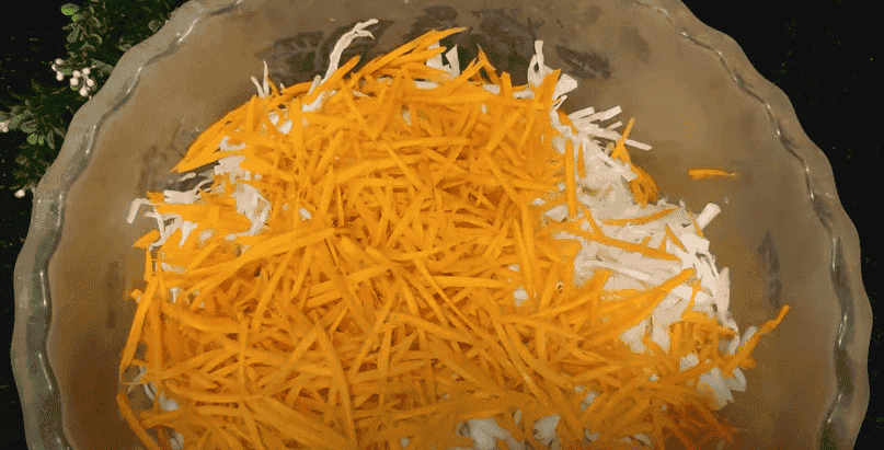 4. Моркву 2 шт, натираємо на тертці для корейської моркви у таз із капустою.