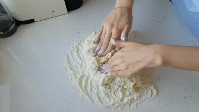 Поступово підсипаємо борошно. Густу масу перекладіть на стіл, присипаний борошном, продовжуйте заміс руками. Після того, як все борошно буде витрачене, вимішуємо тісто 10-15 хвилин.