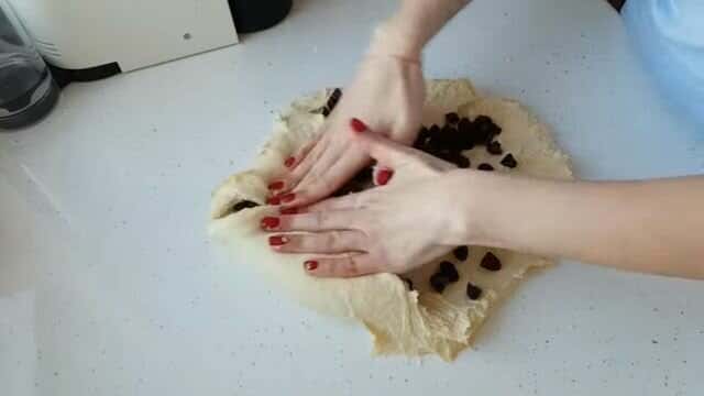 Тісто не буде крутим, і буде липнути до рук, але додатково борошна додавати не потрібно. При бажанні змастіть руки олією. Це полегшить процес.Руками розтягніть тісто в пласт і розподіліть по ньому шматочки родзинок. Збираючи отриманий корж від країв до середини, вмішайте родзинки.
