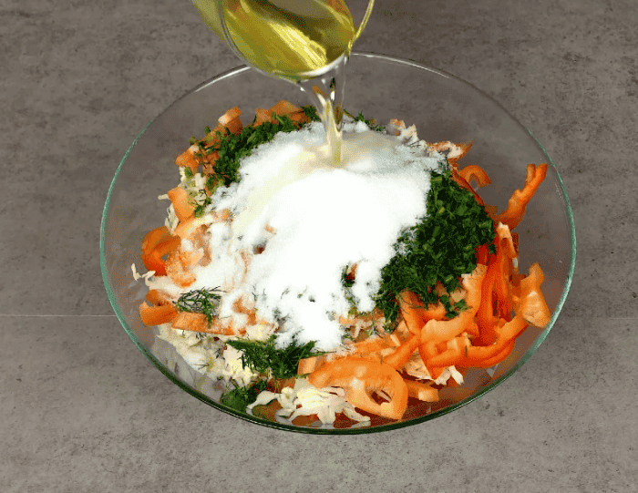 І все добре перемішую, щоб сіль і цукор розчинилися. Накриваю харчовою плівкою і залишаю кубанський салат маринуватися при кімнатній температурі на 2-3 години, щоб овочі дали сік.