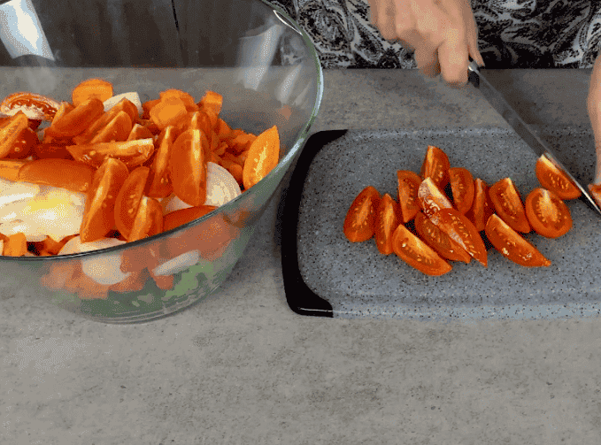 Один кілограм помідорів розрізаю на 4 частини. Вибирайте помідори для цього рецепту міцні, щільні, щоб вони краще зберегли форму в салаті (можна бурі недоспілі).