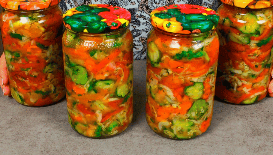Ось такий смачний і гарний салат “Генеральський” або його також називають “Кубанський” із овочів я заготовляю на зиму вже багато років, а банки зберігаю у шафі за кімнатної температури.