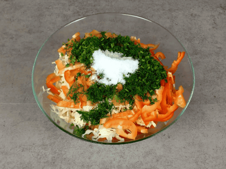 Додаю до салату 2 столові ложки з гіркою солі, висипаю 100 г цукру.