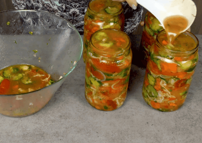 І тепер перекладаю салат у чисті стерилізовані банки, добре ущільнюю щоб не було порожнеч і помістилося побільше овочів. Зверху наливаю овочевий маринад.