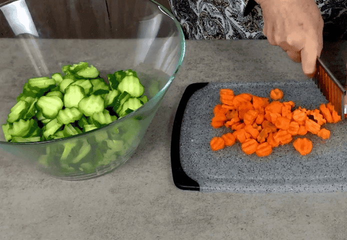 Спочатку підготуємо овочі. Почнемо з огірків. Кілограм огірків нарізаю фігурним ножем для овочів на кружечки або півкружечки, все залежить від розміру огірків. Для цього рецепту підійдуть і великі огірки, що переросли.