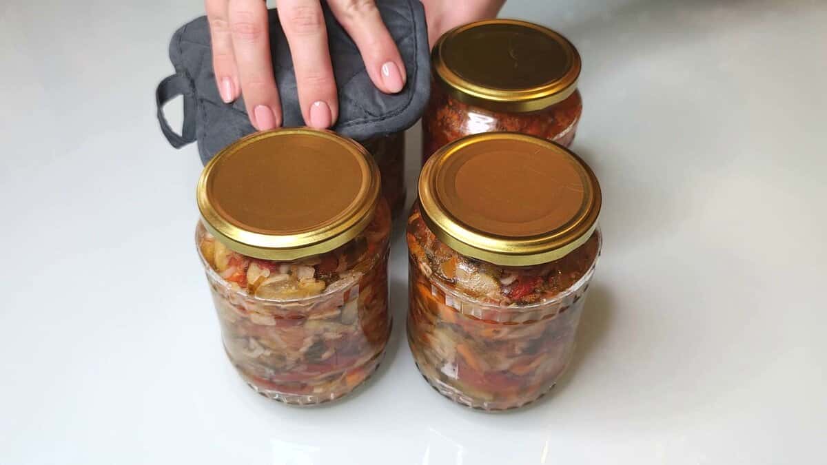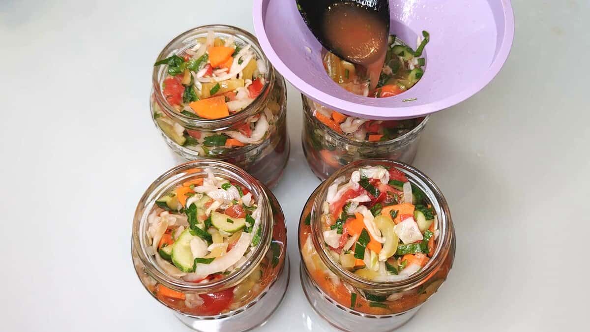 6. Розкладаю салат по банках. Залишки соку теж виливаю в баночки. У мене вийшло 5 баночок об’ємом 0,75 л. Далі накриваю банки кришками.