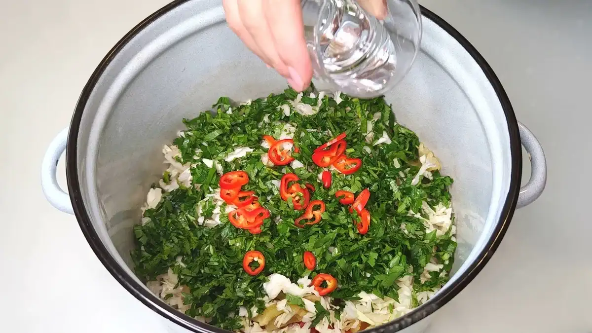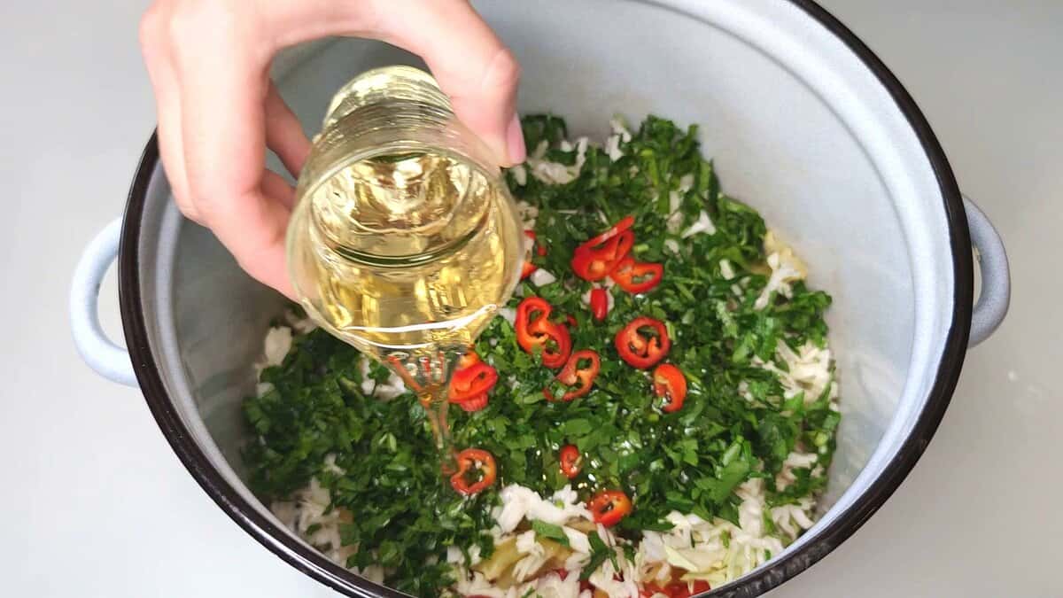 4. Овочів я використовую багато, тому в процесі приготування замінила каструлю на більш об’ємну. Додаю подрібнену петрушку і перець чилі ( можна обійтися без перцю, якщо любите гостре ). Потім додаю оцет.