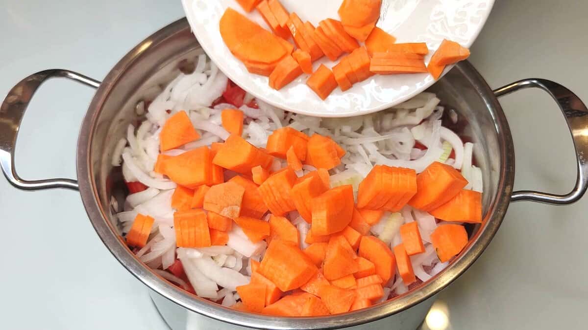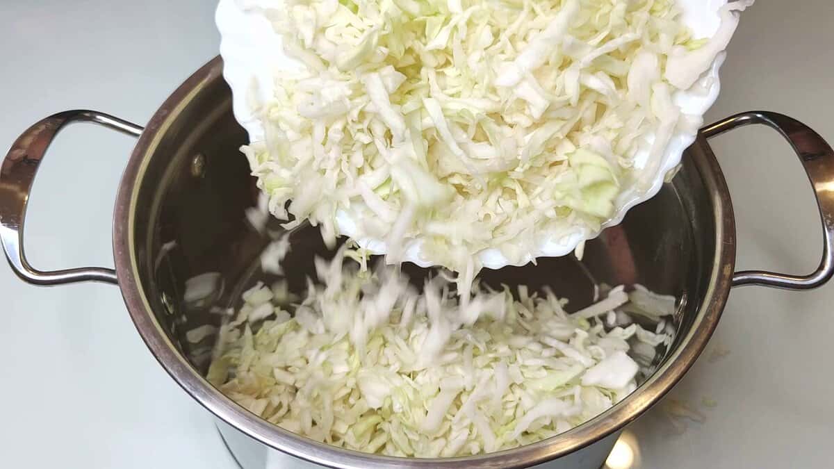 1. Дрібно шинкую капусту і викладаю в велику каструлю. Далі додаю солодкий перець, порізаний соломкою.