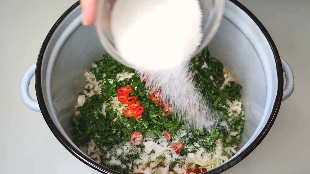 5. Слідом виливаю олія, висипаю цукор і сіль. Перемішую салат і залишаю його маринуватися на 3 години. За цей час овочі виділять велику кількість соку.