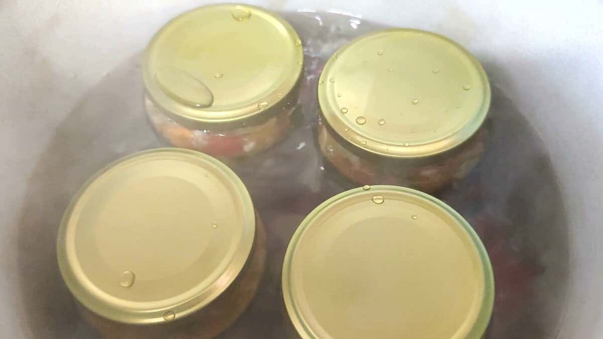 7. Потім беру велику емальовану каструлю і на її дно кладу невеликий рушник. Ставлю в каструлю банки і заливаю їх злегка гарячою водою. Ставлю каструлю на плиту і доводжу воду до кипіння. Стерилізую банки на середньому вогні під кришкою 25 хвилин. Потім гарячі банки щільно закриваю кришками, перевертаю і вкриваю ковдрою до повного охолодження.