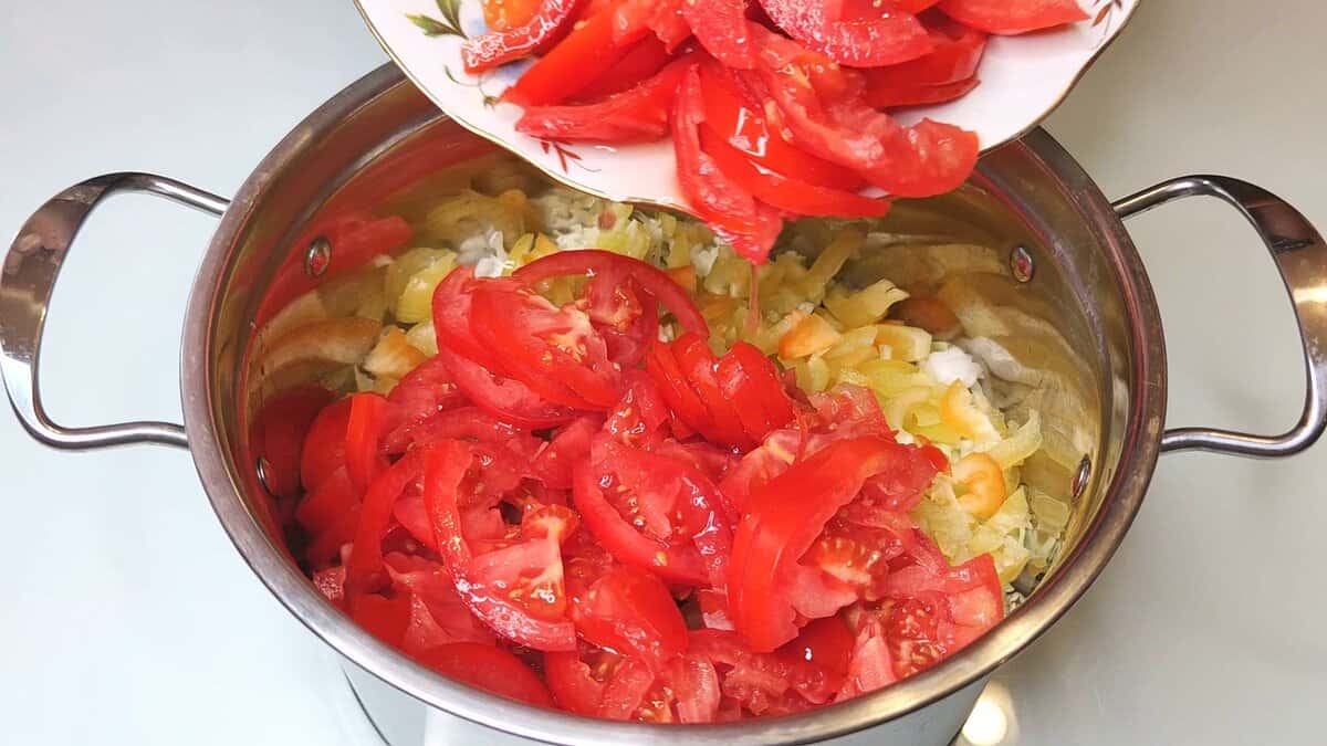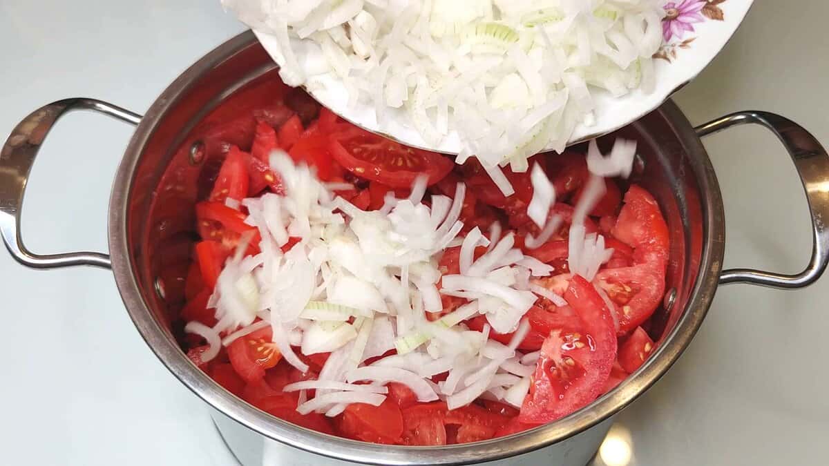 2. Додаю томати. Томати ріжу середніми часточками ( не дрібно ). Далі додаю ріпчасту цибулю, порізану чверть кільцями.