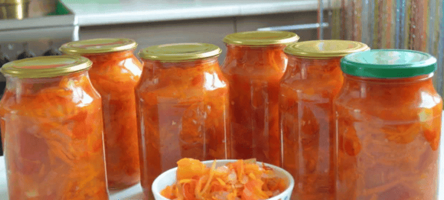 знімаємо і розкладаємо салат у стерилізовані баночки, зверху салат обов’язково заливаємо соком, щоб овочі були в сокові, герметично закручуємо стерилізованими кришками.