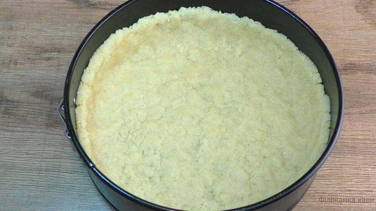 У форму для випічки відправляємо все тісто і розрівнюємо притискаючи по всійй поверхні, роблячи високі бортики.