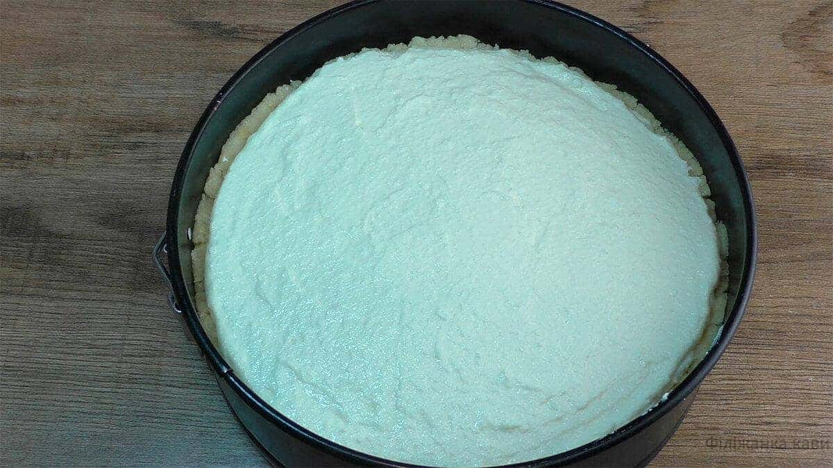Зверху на пиріг викладаємо нашу сирну заливку і розрівнюємо. Залишилося відправити в заздалегідь розігріту духовку до 180 градусів на 40 або 50 хвилин.