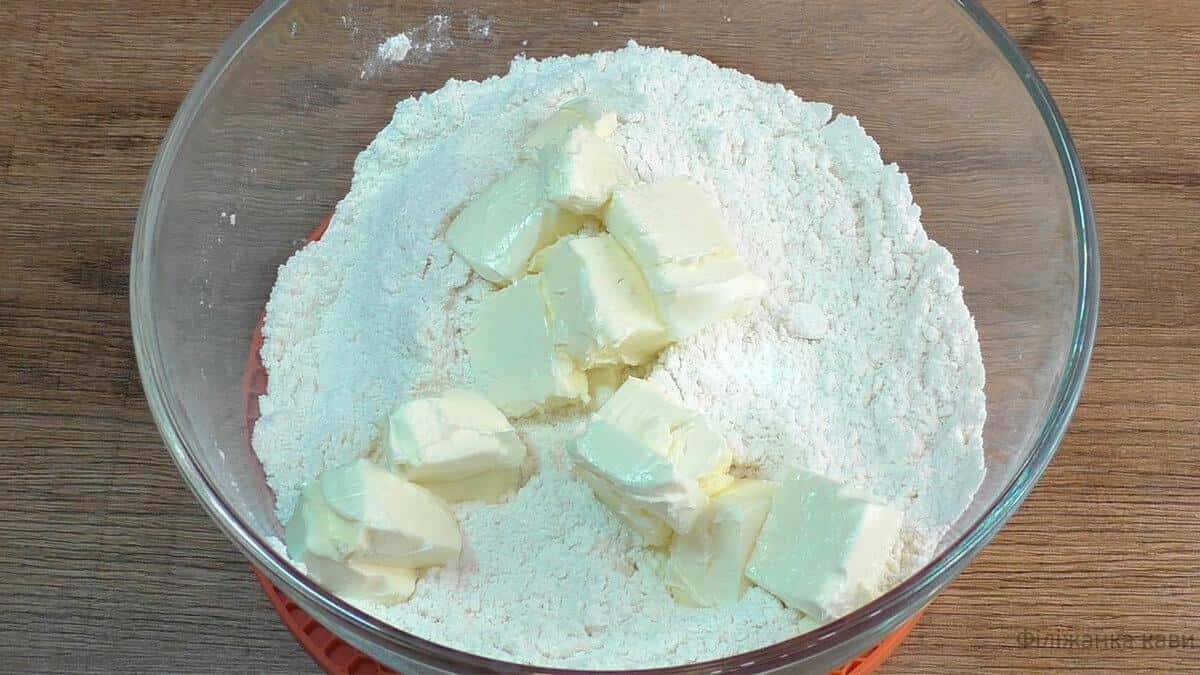 Почнемо з пісочного тіста. У миску просіюємо 250 грам борошна. Всипаємо 120 грам цукру, дрібку солі і 1 ч. л. розпушувача. Перемішуємо вінчиком. Потім додаємо 100 грам вершкового масла.