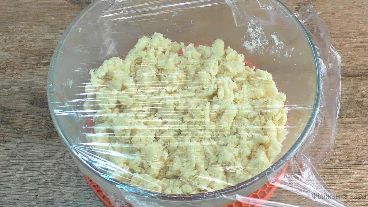 І швиденько руками перетираємо тісто в крихту. Вбиваємо сюди одне яйце і ще раз перемішуємо. Прибираємо поки під плівку в холодильник.
