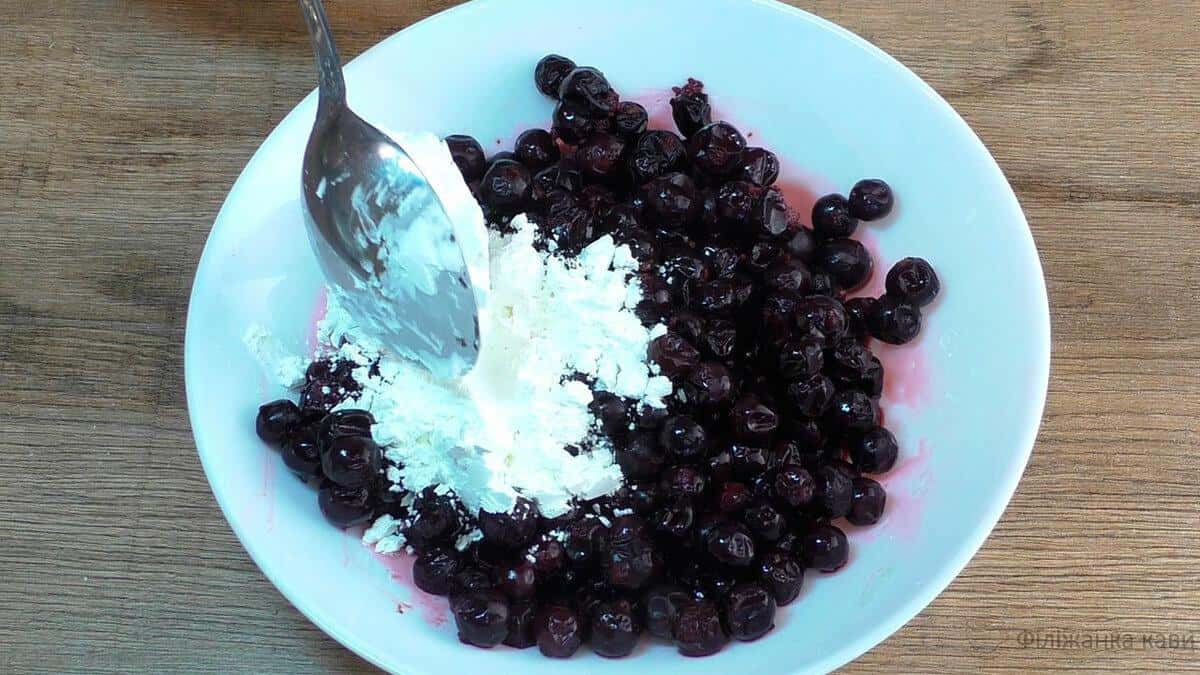 Беру 400 грам будь-яких ягід або фруктів, можна свіжих або розморожених – у мене чорна смородина. Всипаю 1 ст. л. крохмалю, щоб він ввібрав в себе зайвий сік і пиріг не вийшов сирим.