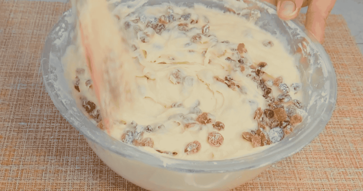 Всипаємо родзинки в тісто, перемішуємо до повного розподілу.