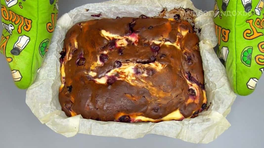 ✅В підготовлену форму (у мене форма 28х21 см, я застели її пергаментом) виливати за допомогою ложки частинами темне тісто та сирну масу, чергуючи їх між собою та розподіляючи всередині вишню.