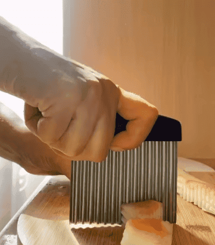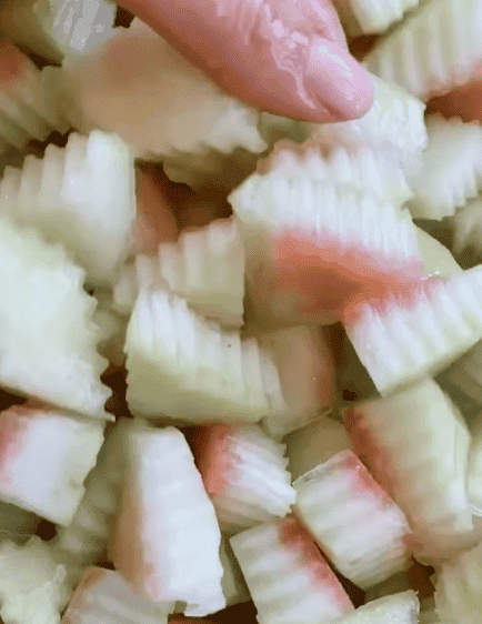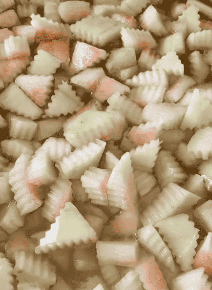 Потім нарізаємо фігурним ножем на ромбики, зважуємо, у мене 4 кг.