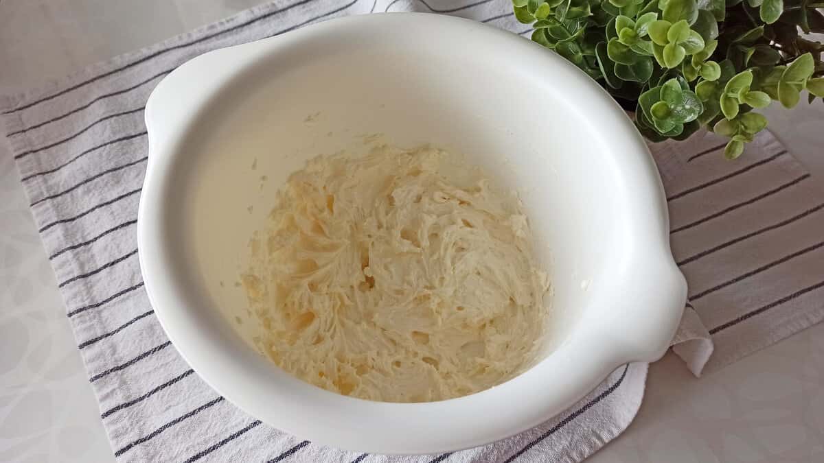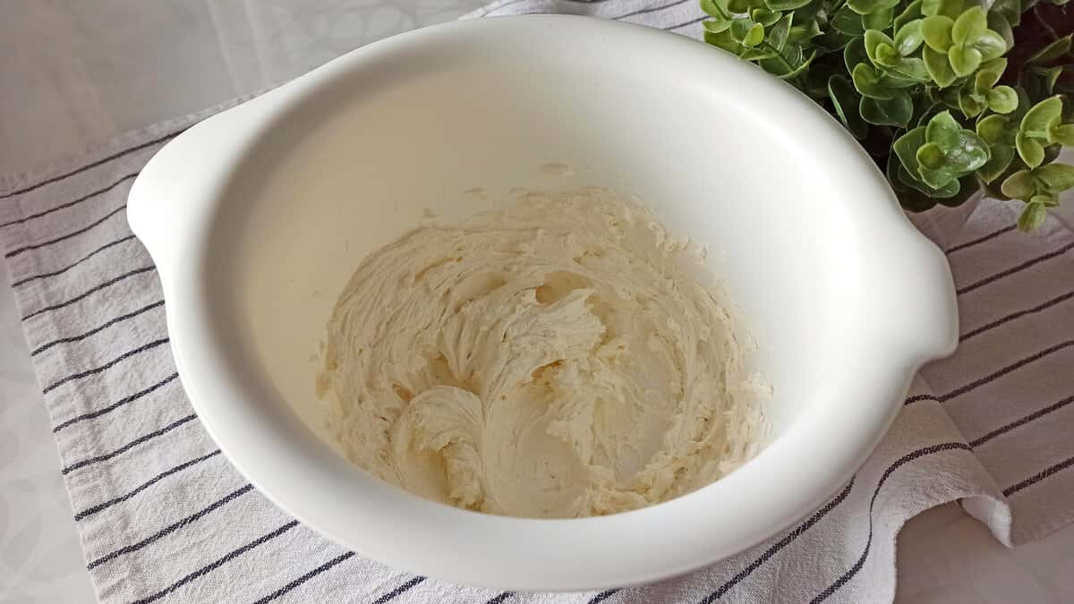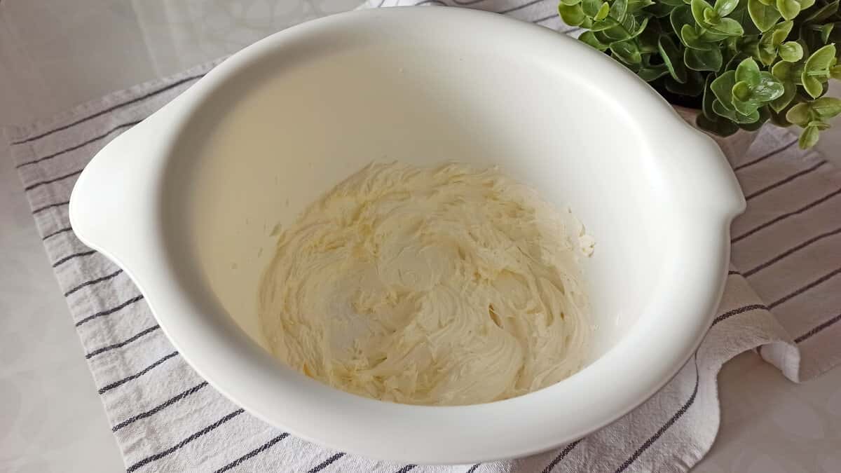 2. Яєчний білок протягом 10 секунд прогріваємо в мікрохвильовій печі. Якщо цього не зробити, маса через різницю температур може розшаруватися і тісто не вийде. Додаємо прогрітий білок і збиваємо ще 1-2 хвилини.