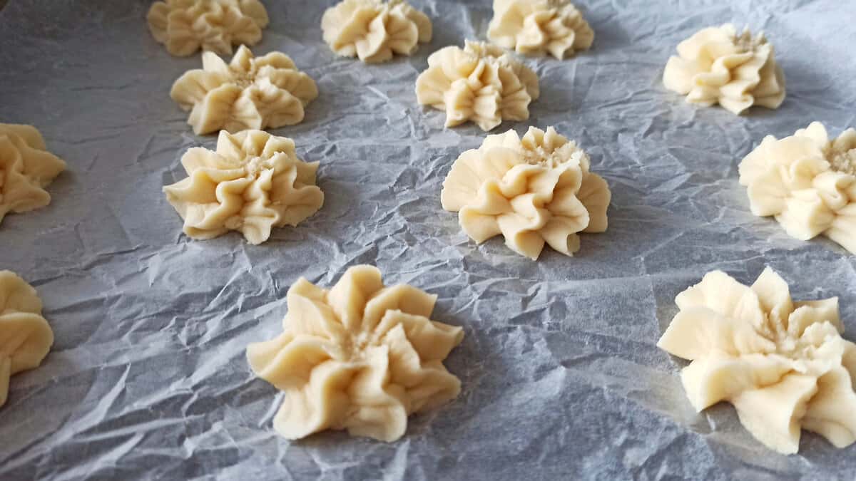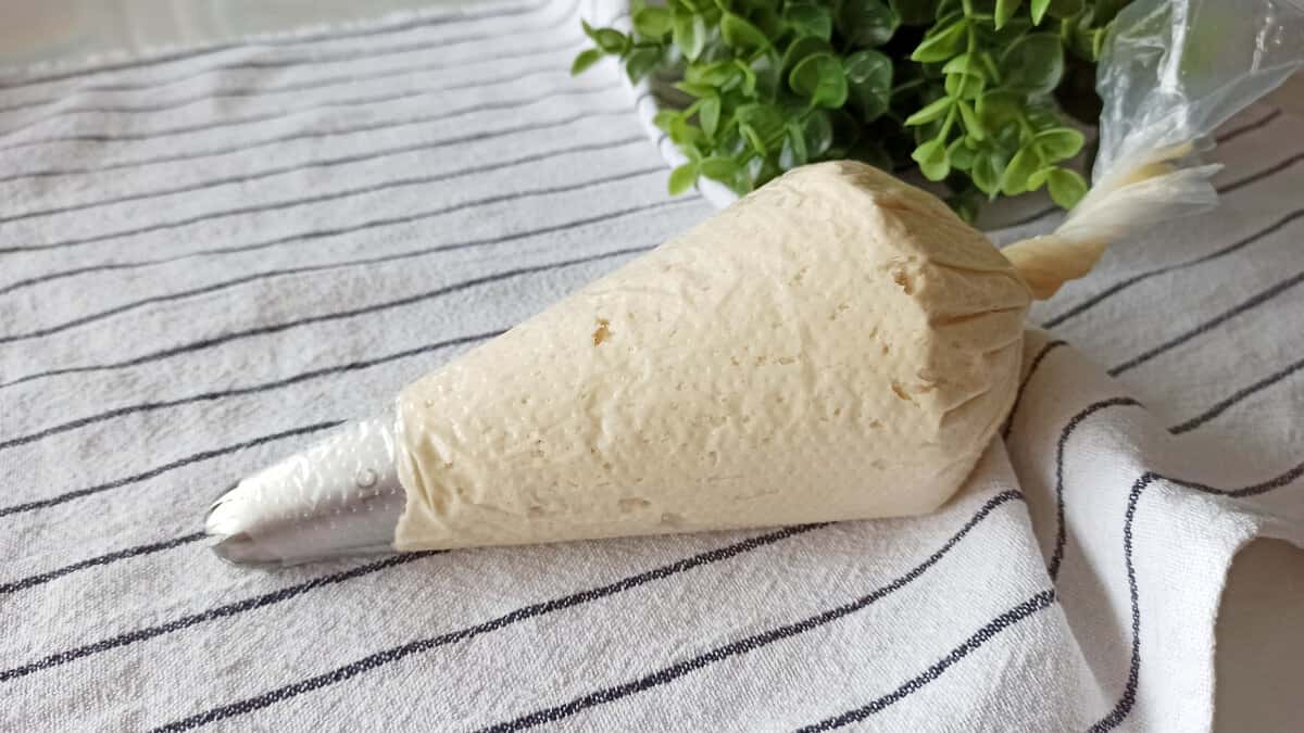 4. Тісто перекладаємо в кондитерський мішок. Дуже важливо, щоб він був щільним і якісним, інакше в процесі відсаджування печива він може лопнути. Відразу ж приступаємо до відсадження печива на деко з пергаментним папером.