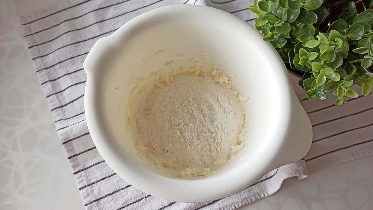 3. Вводимо просіяне пшеничне борошно. Перемішуємо міксером на слабких оборотах до однорідності.
