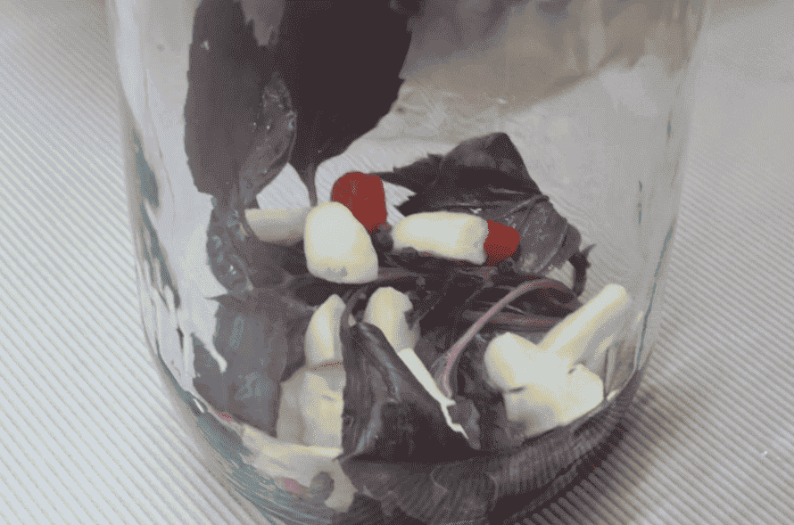 Наповнюємо банку до верху, ладемо гілочку базиліка (або окремо розібрати базилік по листочках) та часник.