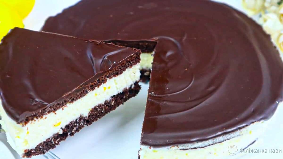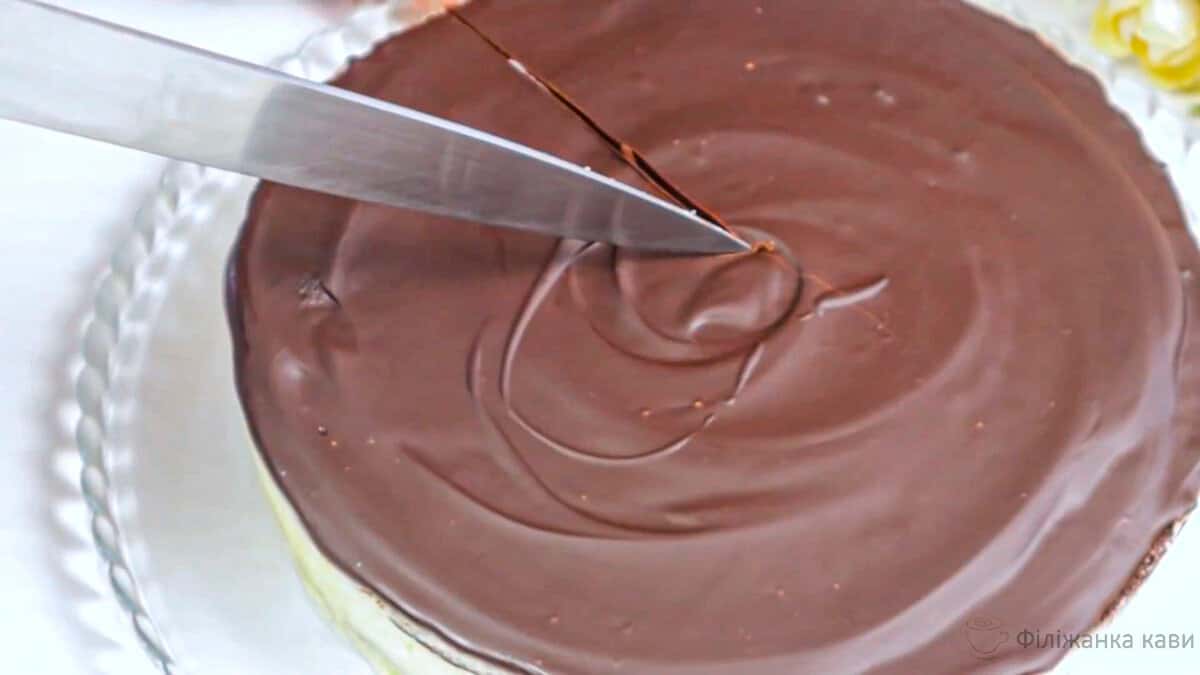Відправляємо в холодильник щоб схопився крем а потім торт покриваємо шоколадною глазур’ю ( шоколад з маслом або какао ).