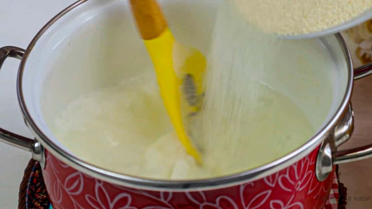 Помішуючи молоко тонкою цівкою всипаємо манку 70 г. Варимо 2-3 хвилини до загустіння. Остуджуємо кашу до кімнатної температури.