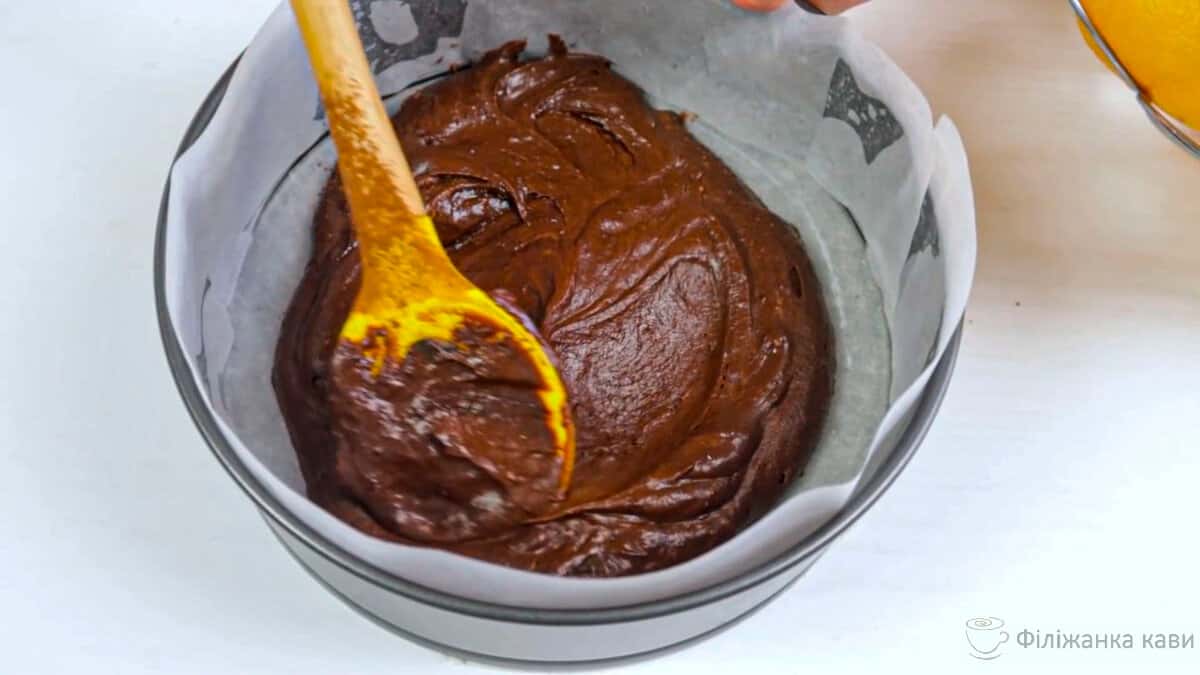 Готуємо тісто. У миску кладемо 100 г м’якого вершкового масла, 70 г цукру і розтираємо ( перемішуємо ). Далі додаємо 3 яйця, дрібку солі, просіюємо 80 г борошна разом з 30 г какао і додаємо 1.5 ч. л. розпушувача. Все ретельно перемішуємо.