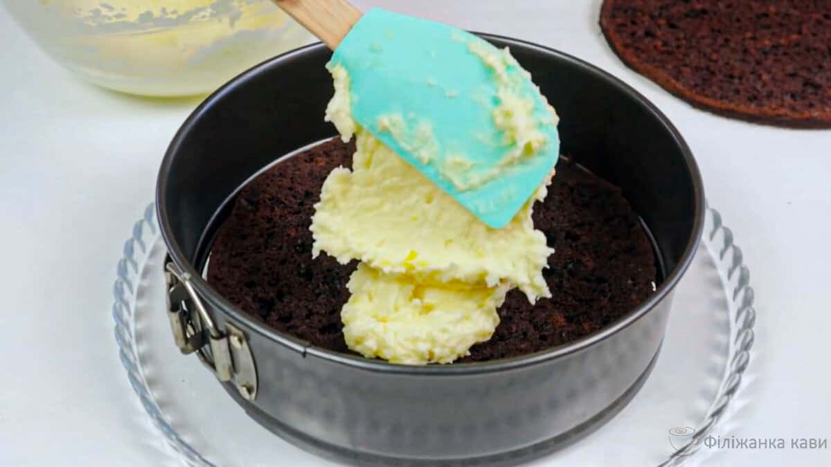 Охололий корж розрізаємо навпіл. Викладаємо наш крем на 1 половинку коржа і закриваємо другою половинкою.