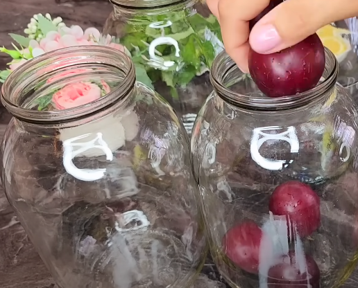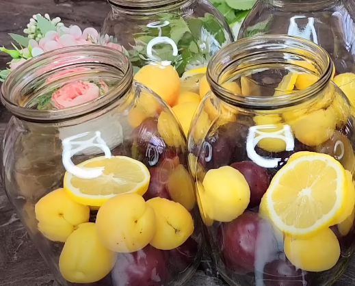На кожну 2-х літрову банку кладемо 5-6 шт сливи та абрикосів.
