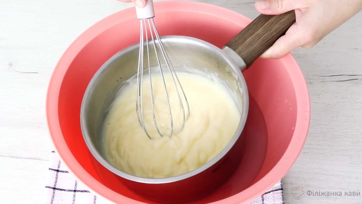 Готовий крем добре остудити. Я це роблю в мисці з холодною водою.