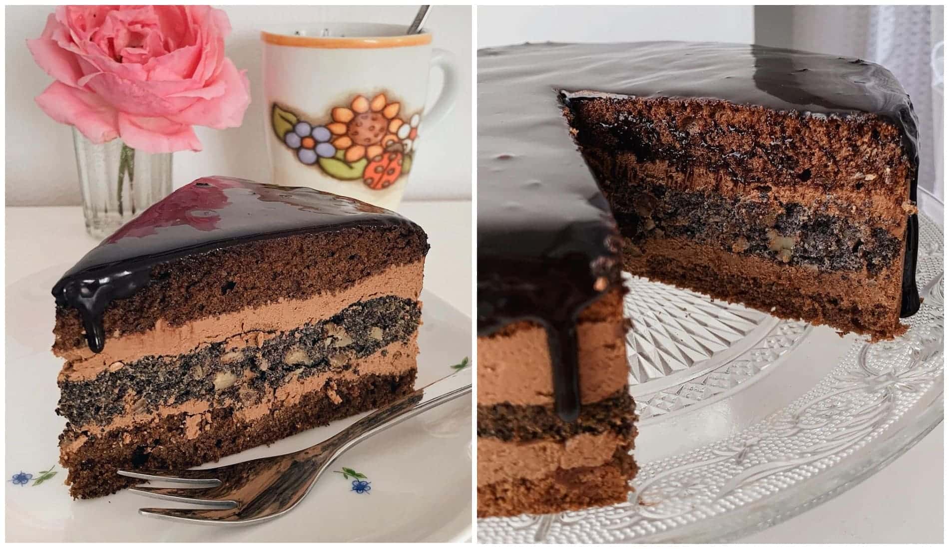 - Бісквіт розрізати на 2 коржі. Пропитати, змастити половиною крему. Викласти маковий корж, пропитати і решту крему. Викласти другий корж бісквіту і пропитати.