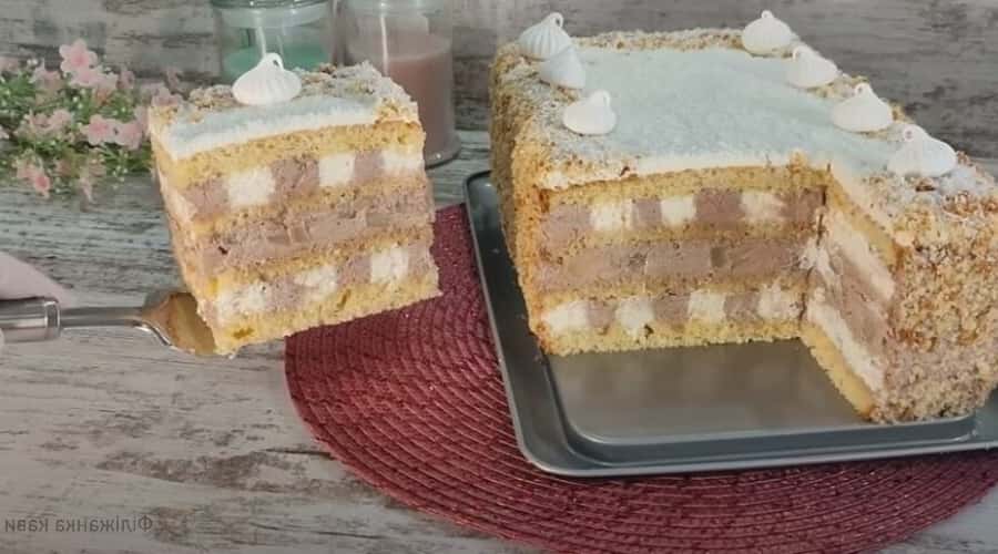 Перед подачею торт краще відправити в холодильник настоятися протягом кількох годин. У розрізі він виглядає вельми цікаво завдяки шаховому порядку нанесення крему. А смак не передати словами! Освіжаючий і ніжний, що вабить. Він точно вартий вашої уваги.