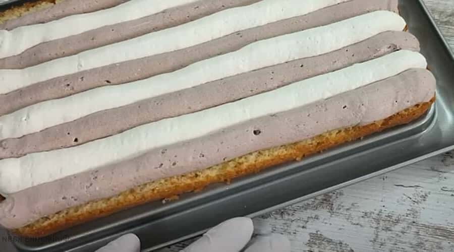 Приступаємо до приготування крему. У нас їх буде два види — кокосовий і шоколадний. Змішайте маскарпоне з іншим несолодким і менш жирним вершковим сиром, додайте решті ванільний цукор і цукрову пудру. Розділіть суміш на дві частини, в одну додайте 50 г кокосової стружки, в іншу — какао-порошок. Обидва креми збийте окремо, викладіть в кондитерські мішки.