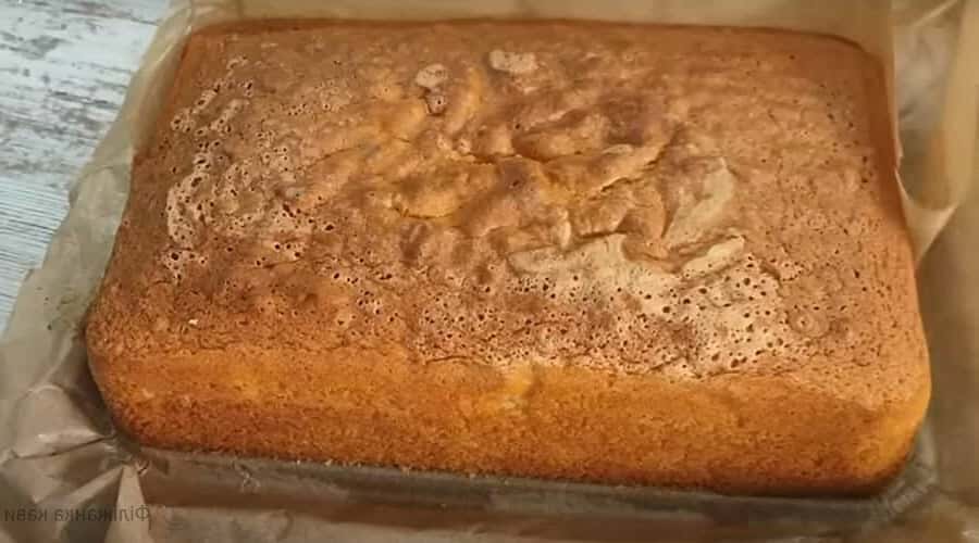 Дно і боки форми для випічки застеліть пергаментом. Вилийте тісто, рівномірно розподіляючи по ємності. Надішліть випікатися в розігріту до 175 градусів духовку на 40 хвилин. Дайте бісквіту охолонути на решітці, потім розділіть його на 4 частини.