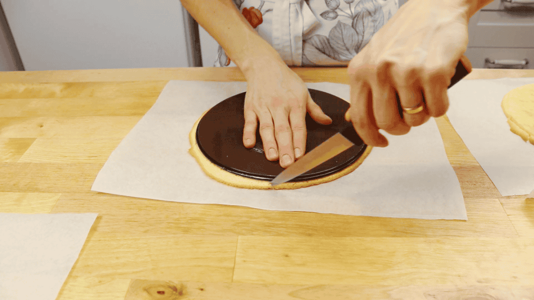 Коржі підрізаю до потрібного діаметра, обрізки використовую для обсипання торта.